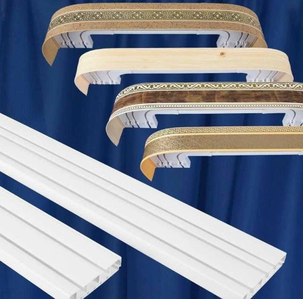 - Пластиковые потолочные карнизы. Легкие, недорогие и простые в установке. Они подходят для легких и средних по весу штор, часто имеют несколько рядов для разных типов крепления.